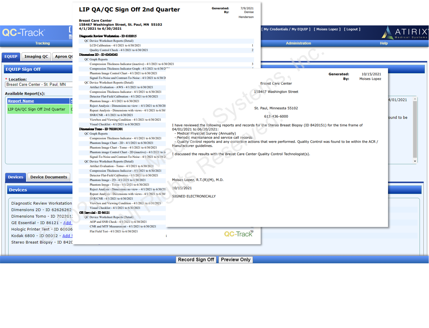 The paperless QC-Track workflow offers a powerful approach for monitoring the QC process and performing electronic QC Sign Off. Imagine the convenience -- Responsible Parties, and especially the Lead Interpreting Physician (LIP), from their desk, can review QC records from any facility on the network, including QC reports and QC documents, and sign off. The QC-Track Sign Off process has been accepted by MQSA inspectors at all levels across the U.S. since 2008.