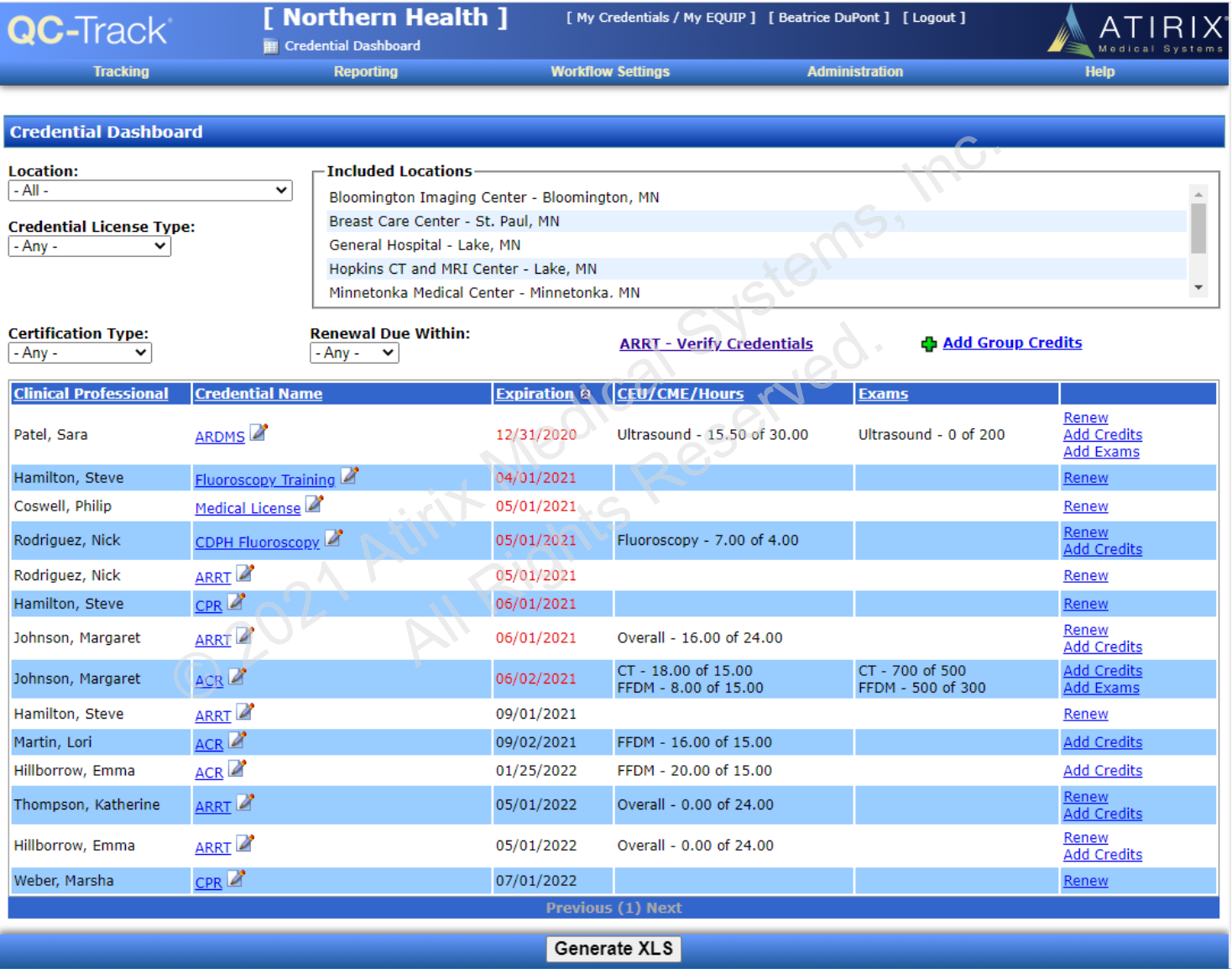 Reports for credentials, CEU, and exam level by modality over a selected period of time for all the clinical professionals in your system